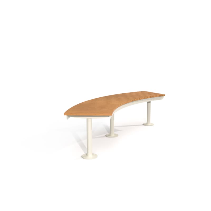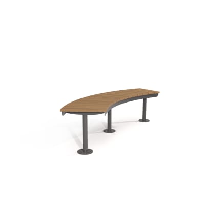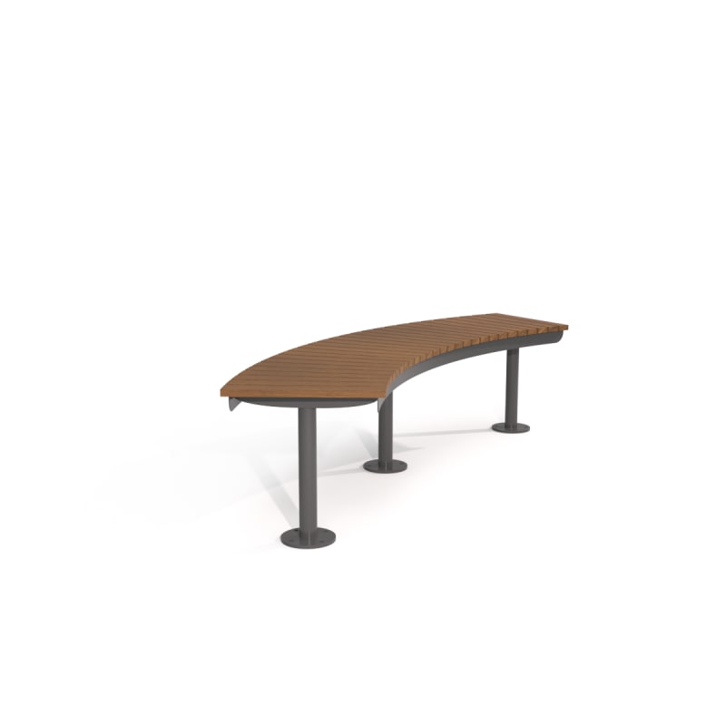Simple, durable curved bench. Batten top in 2 hardwood or 4 Duraslat colors with steel posts and base plates in 17 powder-coat or galvanized finishes.